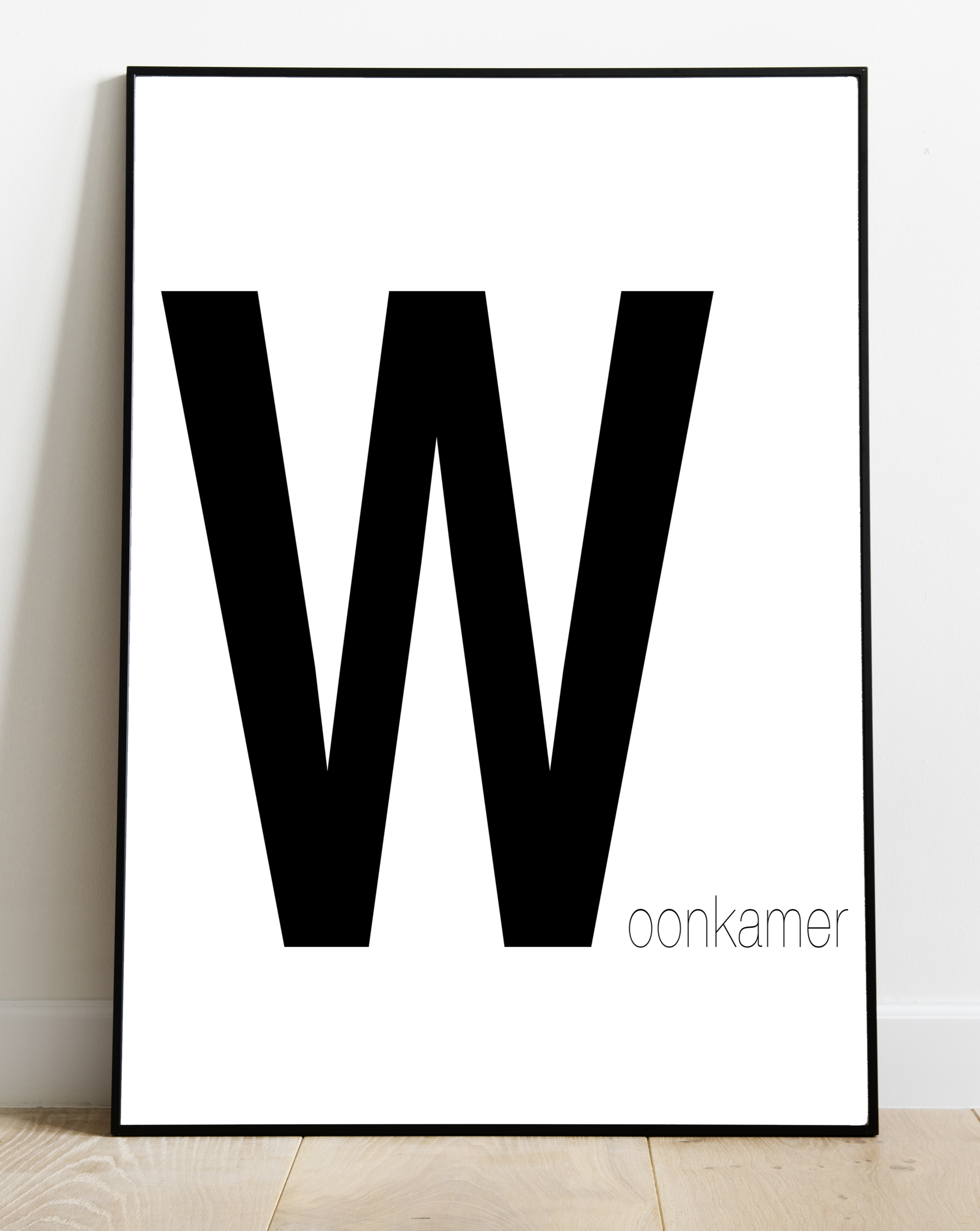 Brighten up your living room with this trendy black and white graphic poster, with the text Woonkamer (Dutch for Living Room). The text poster has a nice thick font and is ideal to combine with other posters. Modern and trendy for a black and white Scandinavian interior. Hang the poster on the wall or place it on the floor.