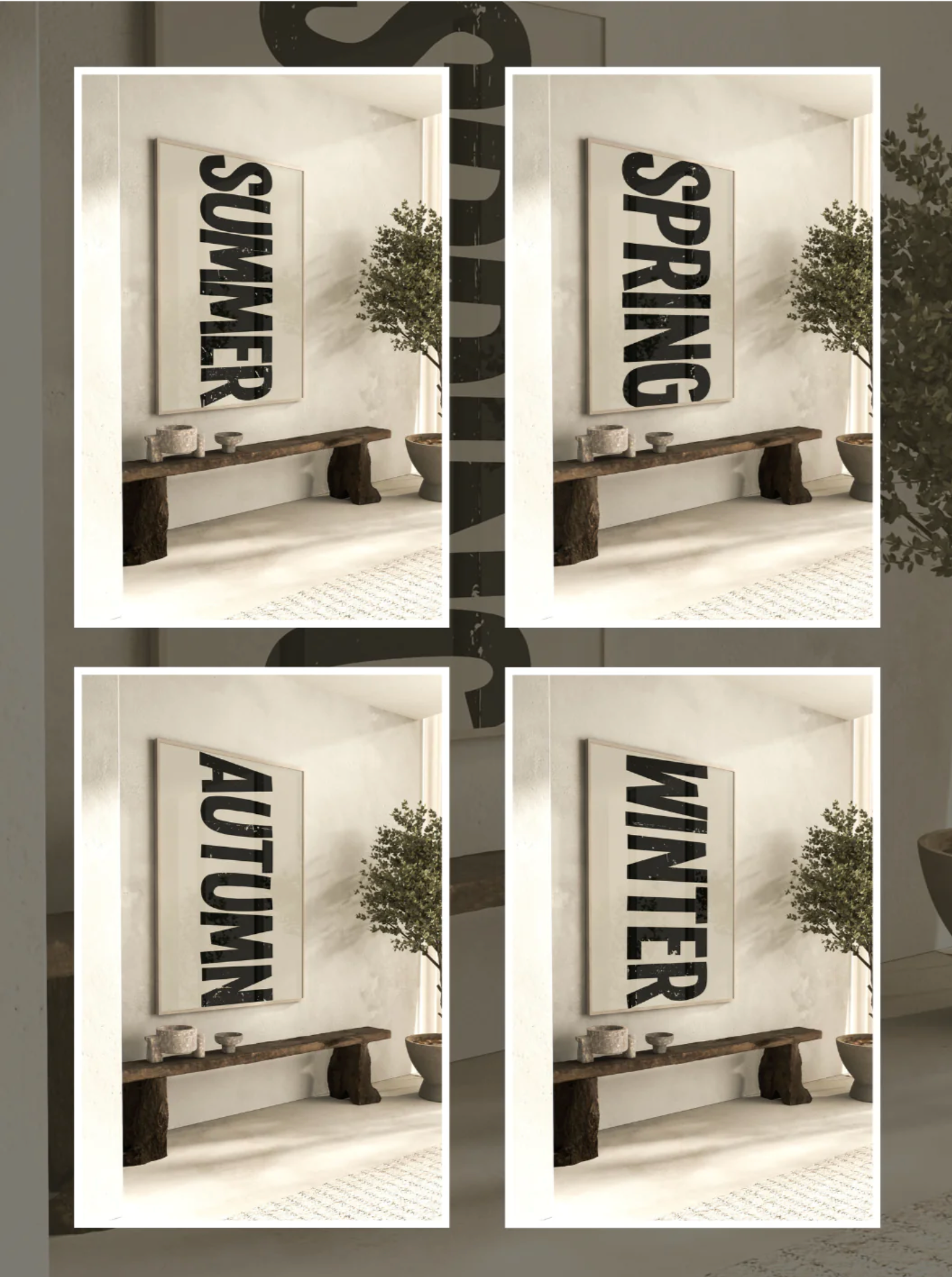 Do you like variety? How nice to be able to hang up a new poster every season. This seasonal pack, consisting of four posters: spring, summer, autumn and fall, is inspired by the subtle aesthetics of Japandi and Scandinavian modern design. These posters have a timeless elegance that fits perfectly with your contemporary interior.