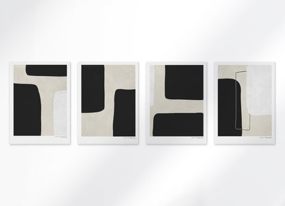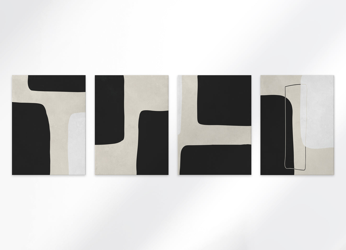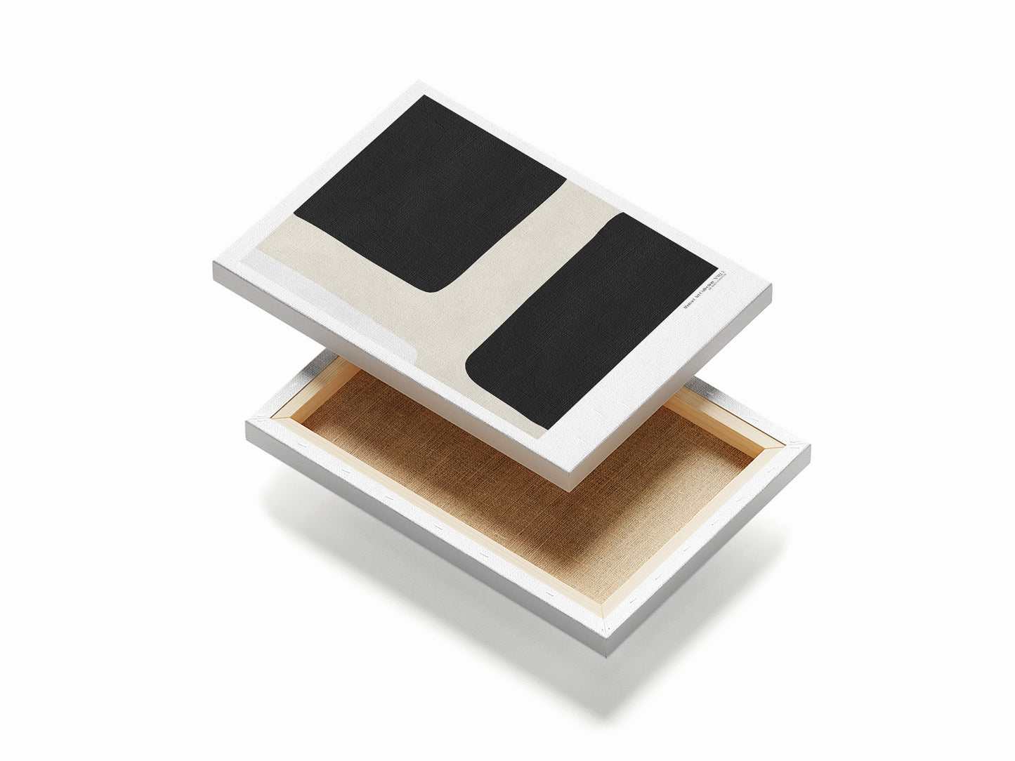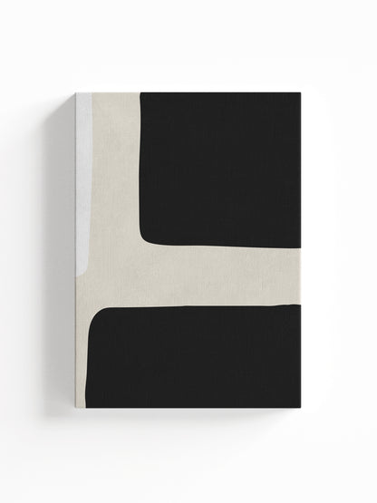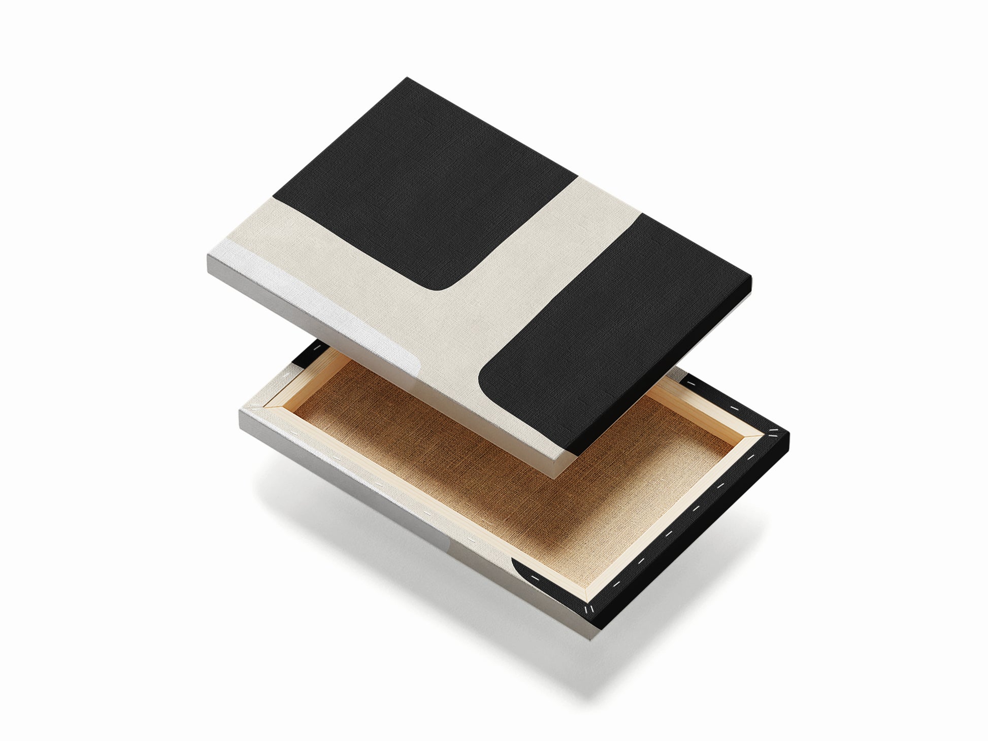 Geef een moderne touch aan je huis met deze geometrische canvas print. Deze grafische illustratie heeft een mooie beige achtergrond, gecombineerd met zwarte en witte vormen. De perfecte muurdecoratie!